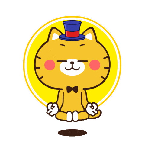 A cute yellow cat character wearing a top hat and bow tie, meditating peacefully in a lotus position, floating calmly.