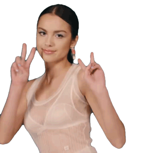 Olivia Rodrigo smiles and makes peace signs with both hands, wearing a sheer white top. A cheerful and iconic pose.