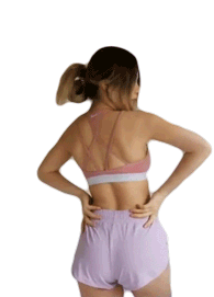 Chloe Ting strikes a playful peace sign pose, turning back with a glance in a pink sports bra and purple shorts.