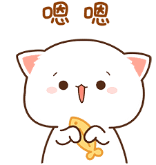Cute Peach cat sticker holding a golden fish and saying 'Mm-hmm' (嗯 嗯) with a happy expression.