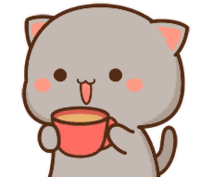 Peach Goma, the cute cartoon cat, is happily drinking a warm beverage from a red cup, steam rising from it.