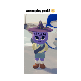 Purple cartoon character wearing a witch hat, with the animated text "wanna play peak? 🤔" appearing above its head.