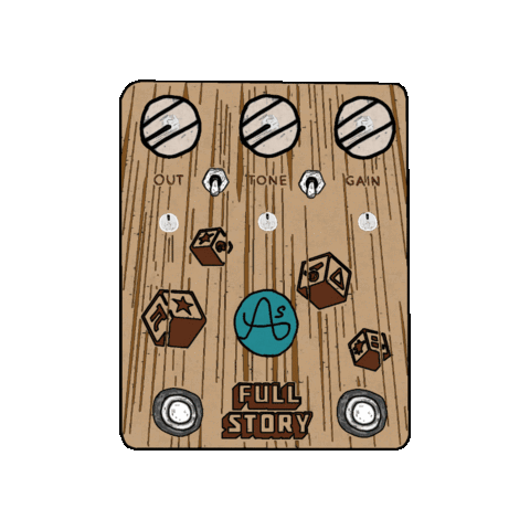 An animated sticker featuring the Anasounds Full Story Fuzz guitar pedal, showcasing its wooden design and controls.