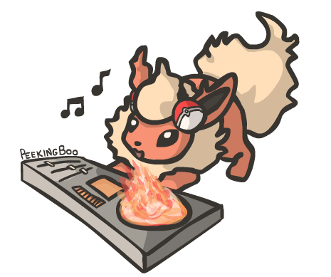 Flareon, by Peekingboo, rocks the DJ booth with headphones and fiery beats, perfect for music and Pokémon fans.