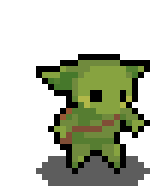 A charming pixel art green goblin, Kaperoo from Peglin, stands ready for adventure with a small satchel.