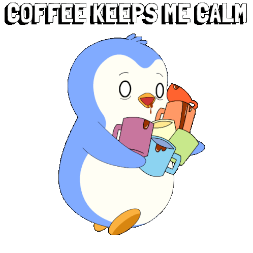 a penguin is holding a bunch of coffee mugs and the words coffee keeps me calm