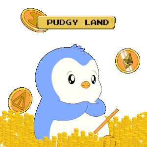 a penguin is standing in a pile of gold coins under a banner that says puggy land