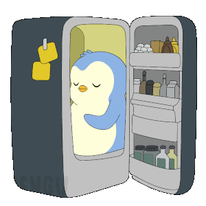 A cute Pengu Pudgy penguin peacefully sleeps inside an open refrigerator, nestled among food items.