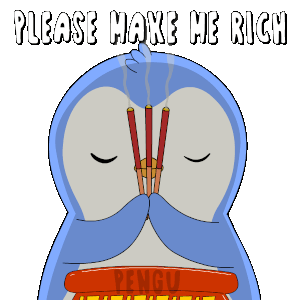 A Pudgy Pengu character praying with incense sticks, wishing for wealth with "Please Make Me Rich".