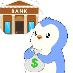 A cute Pudgy Penguin holds a money bag, happily thinking about depositing savings at the bank.