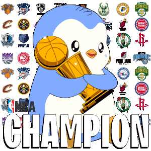 Pengu Pudgy, the adorable penguin, joyfully embraces an NBA championship trophy and basketball, surrounded by team logos.