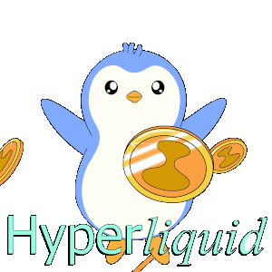 A cute Pengu Pudgy penguin character juggles golden Hyperliquid coins, with the "Hyperliquid" text below.