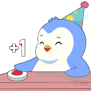 Pengu the pudgy penguin, wearing a party hat, presses a button to add '+1', celebrating a birthday.