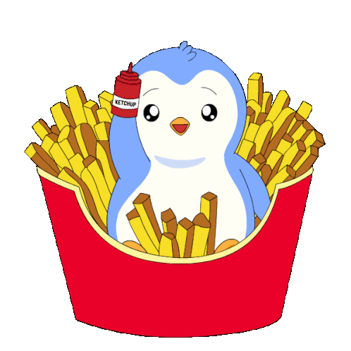 Pudgy Pengu celebrates 'Fry Day' in a bucket of golden fries, holding a ketchup bottle with excitement.