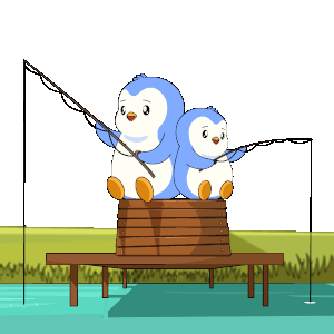 Pengu and Pudgy penguins enjoy a peaceful day fishing together on a wooden dock. A cute and heartwarming scene.