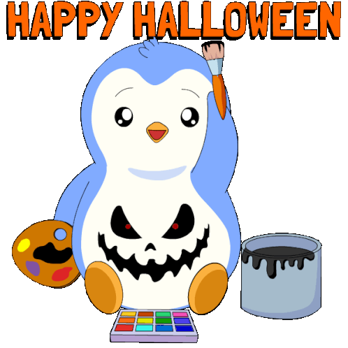a penguin paints a pumpkin with a brush and the words happy halloween