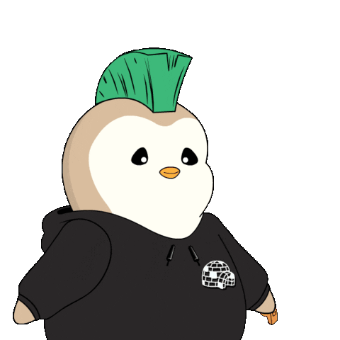 A Pudgy Penguin character, dressed in a hoodie with a green mohawk, blows a whistle like a referee.
