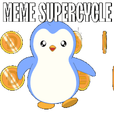 a penguin is holding a bunch of gold coins with the words meme supercycle above it
