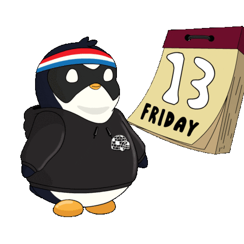 Pudgy Penguin in a hoodie and headband holds a calendar showing '13 FRIDAY', celebrating Friday the 13th.