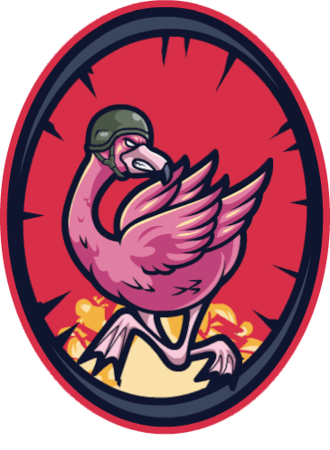 An aggressive pink flamingo in a military helmet runs from an explosion, representing the Penicotteri Warhammer 40k community.