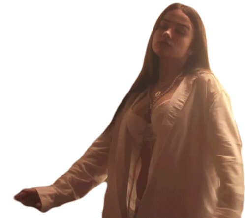 Shainny, a woman with long dark hair, wearing a white shirt and pearl necklace, poses with a thoughtful, uninterested expression.