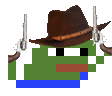 Pepe D the frog, depicted in pixel art, wears a cowboy hat and wields two revolvers, one glowing brightly.