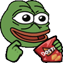 Pepe the frog meme character happily munching on a bag of Dosti chips, enjoying a tasty snack.