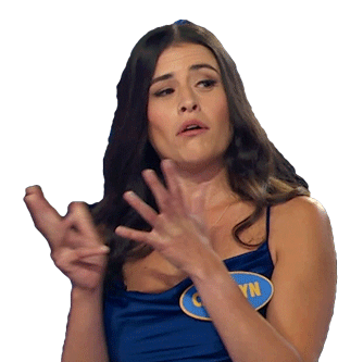 Carolyn from Family Feud Canada makes a confused or questioning gesture with her hands, expressing uncertainty.