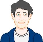 Pixel art sticker of Permanent Comedy comedian Greg Nibler, a man with a beard in a blue jacket.