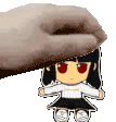 A hand gently pets an adorable Fumo plushie, showing affection and care for the cute doll.