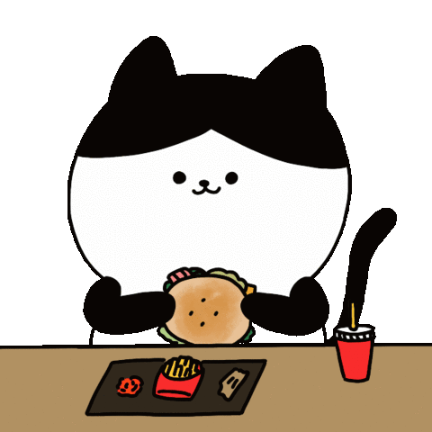 A charming cartoon cat happily devours a delicious hamburger, accompanied by a side of crispy french fries and a drink.