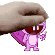 a hand is holding a purple cartoon character with a toothbrush in its mouth .