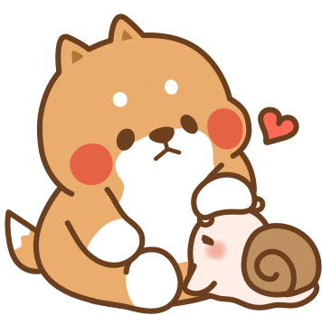 A cute cartoon Shiba Inu dog gently pets a small, happy snail, with a heart floating above its head.