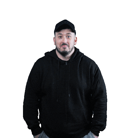 a man with a beard wearing a black hoodie and a hat with the letter t on it