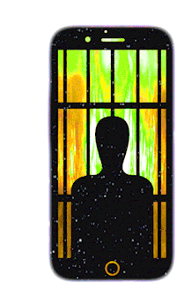 A trippy, colorful animated sticker featuring a phone with a silhouette of a man behind jail bars.