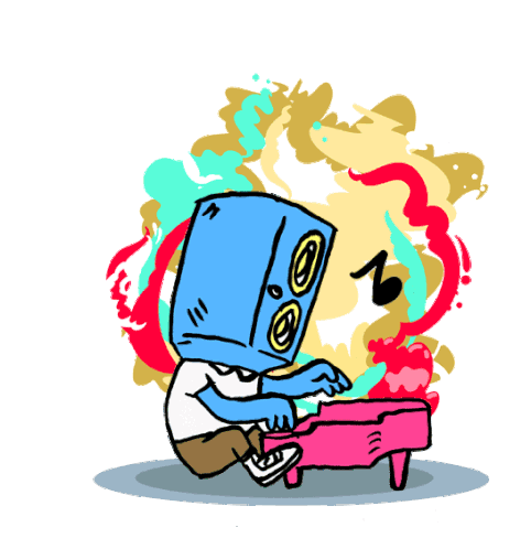 An animated character with a speaker for a head, created by Geo Law, plays a pink piano with musical notes floating around.