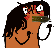 A pixelated cartoon character, possibly Rita Pita, with wide eyes and red cheeks, comically eating a pickle.