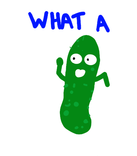 A funny green pickle character with arms and legs, exclaiming 'WHAT A' in a playful, cartoon style.