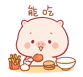 A cute cartoon pig with rosy cheeks is happily eating a variety of foods, including fried chicken, fries, a burger, and soup.