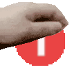 A pixel art hand holds a red circle with a white 'U' that gently pings, creating a subtle animated effect.