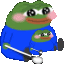 a green frog wearing a blue sweater and holding a sword .