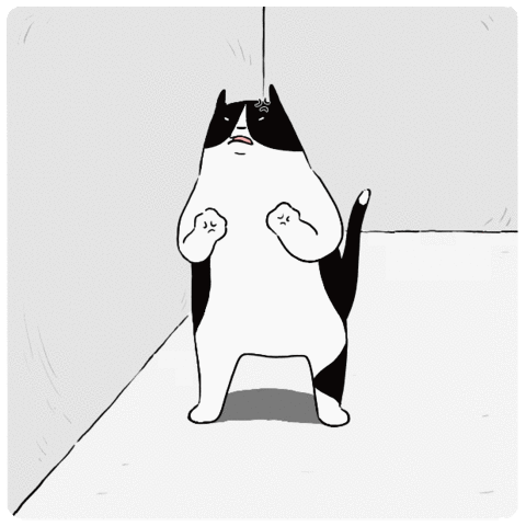 An angry black and white cartoon cat stands in a corner, clenching its fists and looking extremely annoyed and frustrated.