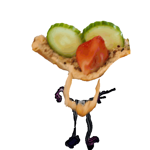 a drawing of a person holding a piece of bread with a strawberry and cucumber on it