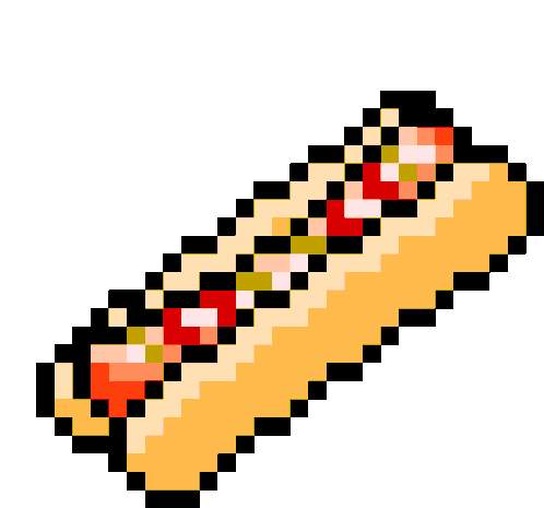 A vibrant pixel art hot dog, complete with ketchup and mustard, rotates and animates playfully.