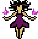 A pixel art mage character in a purple dress, with dark hair and glowing purple magic emanating from her hands.