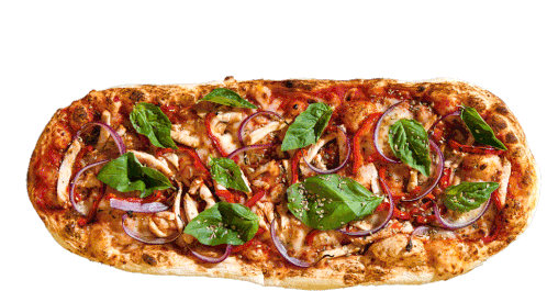 A mouth-watering flatbread pizza topped with melted cheese, pepperoni, red onions, and fresh herbs.