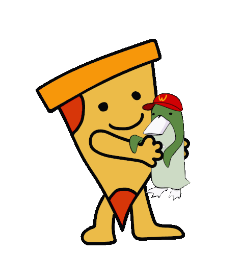 Animated sticker of a pizza slice holding a Wassie character wearing a red cap with a 'W' logo, swaying playfully.