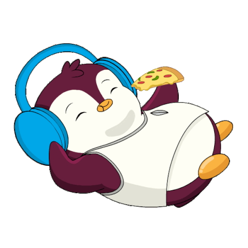 A pudgy penguin character humorously attempts a workout while simultaneously enjoying a slice of delicious pizza.