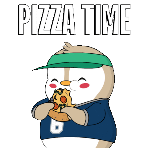 A cute cartoon penguin, wearing a green visor, happily munches on a slice of pizza with 'PIZZA TIME' text above.