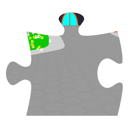 A vibrant puzzle piece from Pkxdpuzzle Pk Xd, featuring a blue umbrella-like object and green grass with paw prints.